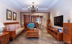 采用石膏板藻井式的吊顶挑高天花,加上全开放式的连接餐厅走道,塑造出客厅的开阔大方格调,给人自在轻松的感受;整体奶白色的乳胶漆处理,加上米色如胶漆处理的背景墙,增强空间的视觉感官,营造房间明亮舒适的环境。地板采用土褐色的仿古砖装饰,带入美式的怀旧情调,给人亲近的家的感觉。