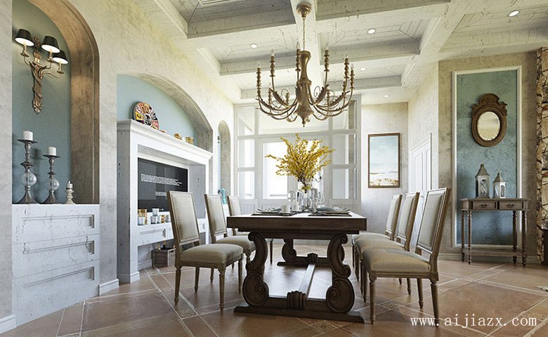 美式装修风格的饭厅混入欧式元素,天花设计成方格状加以细网格的饰入小圆排灯,创意吊灯设计,半凿穿的拱形壁面装修,既可当酒柜使用又可以放些小装饰物,美式的家庭餐桌餐椅颜色刚好与棕色的地板相互映衬。