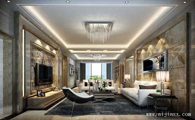 选择石膏板平面式搭配走边造型吊顶天花,中空的结构暗藏光源提供客厅柔和舒适的照明。电视背景墙选择大理石装线条装饰出镜中框,沙发背景墙也采用对应的造型,搭配上银镜装饰边框,填充上发米黄色的抛光人造大理石墙砖拼花填充,辅以天花的精致石膏线条装饰,塑造出客厅优美迷人的环境。