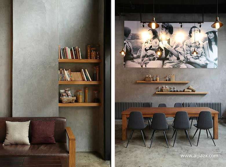 160平米咖啡厅装修设计方案及咖啡厅设计效果图说明,本咖啡店铺设计以loft风格为主,整个店铺的材料以钢材和混凝土,其中一楼地面与墙壁的主要材质为清水混凝土,一楼与二楼的用钢楼梯连接,二楼夹层则使用木地板,顶面则采用露出结构并全部喷黑的方式。