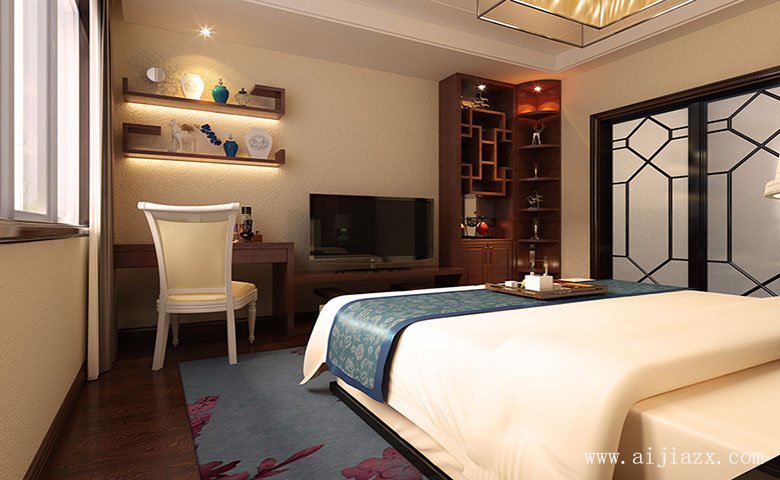 白色简约的卧室运用了中式雕花门与实木柜,白色石膏板吊顶搭配中式吊灯,红色实木书桌与电视柜连接,充分利用了卧室空间。墙壁搁板架增加卧室书桌的收纳空间,实木饰物架放在卧室内显得大气多了,红色实木地板铺垫上灰色地毯,并不宽阔的卧室巧妙利用推拉门设计节省空间。