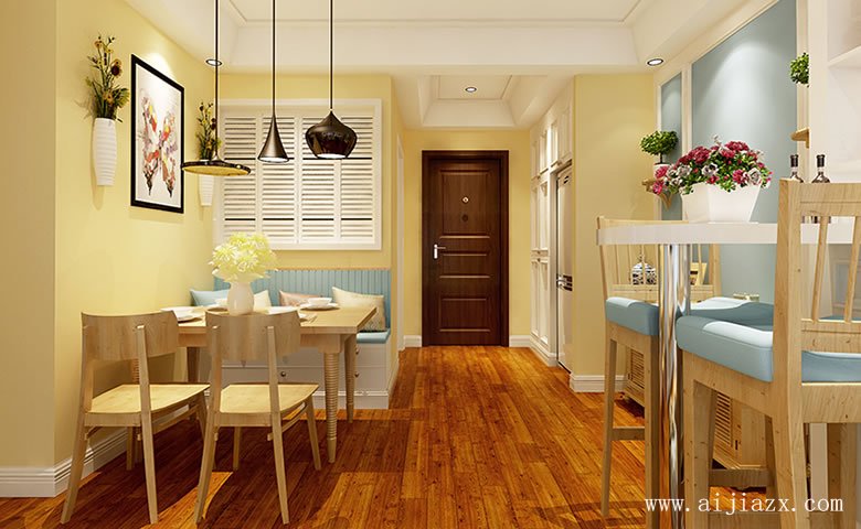 延续客厅的棕色实木地板,白色天花吊顶使用几根实木条收边,增加线条感,悬挂的现代风格简易吊灯,浅黄色涂料粉刷餐厅背景墙,加上一些简易的墙体装修增加视野趣味性。实木餐桌餐椅,一张餐厅沙发紧靠墙体,沙发下层做成收纳柜,增加餐厅收纳功能,这样的餐厅设计简易方便,实用性强,深受年轻人的喜爱。