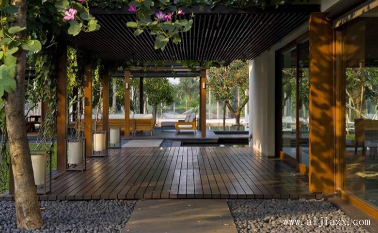 简单的木柱隔断中式的空廊结构,天花采用防腐木格栅装饰,制造出视觉的透视感,搭配上整体婉转的结构,增加景深,同时构造出中式特色的雅逸环境,给人舒适的视觉感受。地板选择生态木装饰走道,柔和的木质带给人轻松的触感,错落的填充鹅卵石装饰,增加景色的变幻,丰富度假山庄的观赏性。